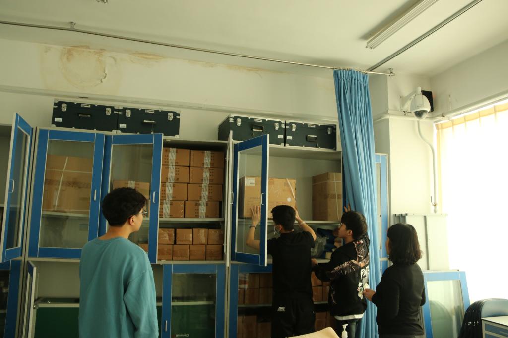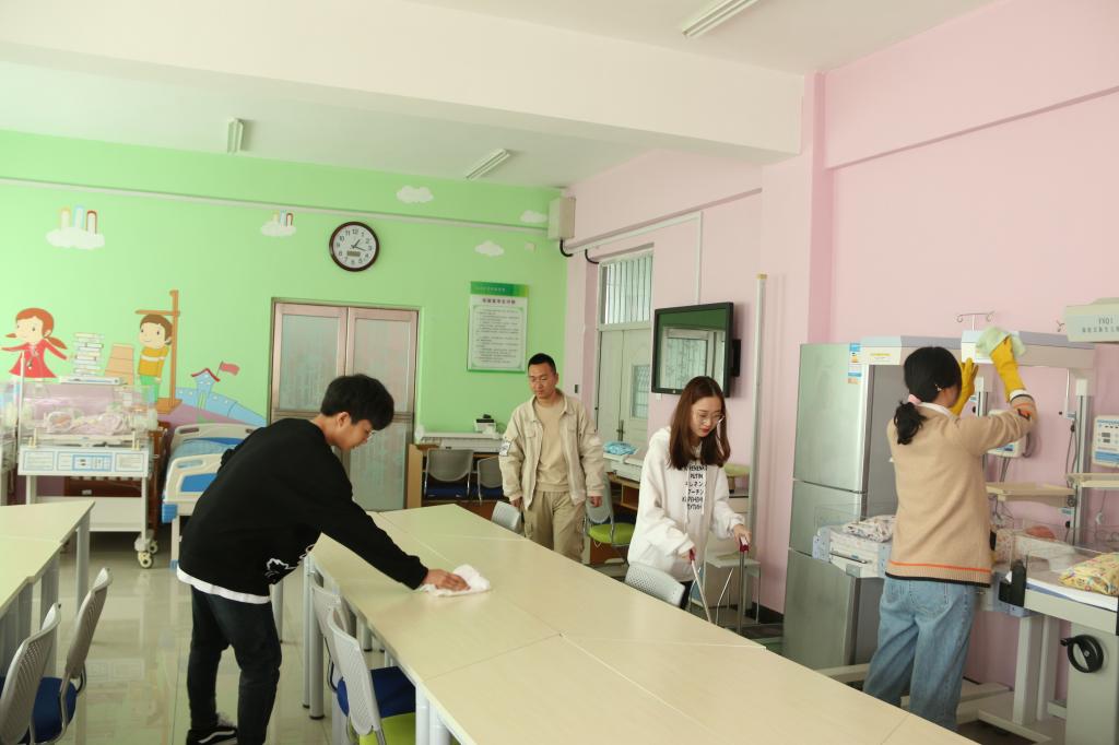 活动中,在老师们的指引下,同学们有条不紊地工作起来。负责各个教研室的同学很快进入了工作状态,女生们细致地将窗台、书桌、柜子上的灰尘擦干净,不放过任何一个小角落。有些爱留下水印的地方,同学们则拿卫生纸一点一点地擦拭,小心翼翼地将擦好地方的物品归回原处。男生们负责将重物放到相应地点。将地面打扫干净后,又继续拖地。各个地点的同学都分工明确,搭配着干好每一项工作。结束后,每个屋子都变得更加明亮整洁。虽然“汗水与尘土起飞”,但每个成员仍坚持劳动,深刻体会奉献精神的重要意义。